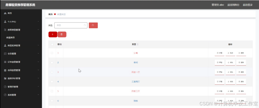 b)房屋类型管理:管理员可对所有的房屋信息进行分类管理,便于用户根据类型搜索。