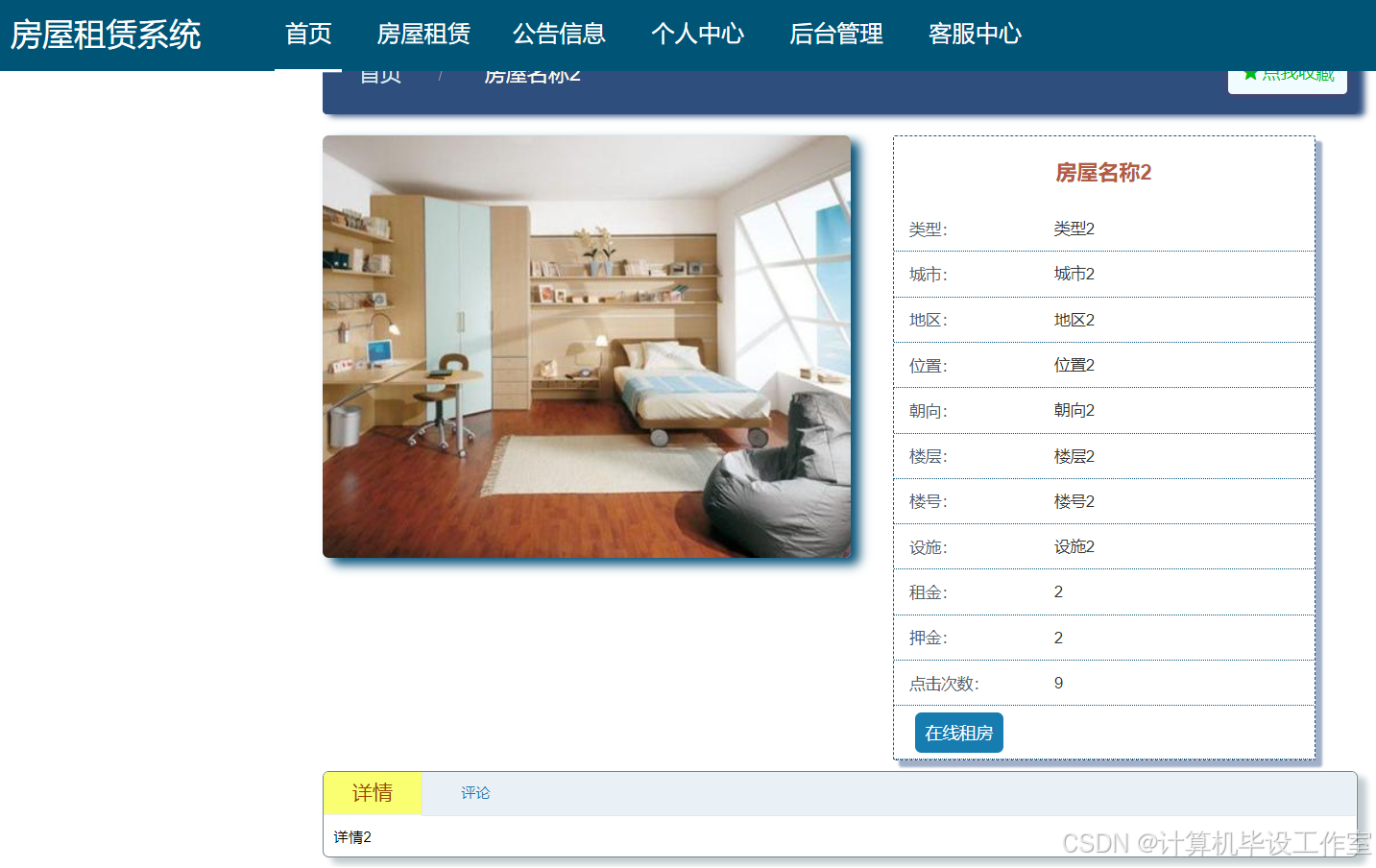 | 测试步骤 | 1. 登录系统。 2. 进入房屋租赁模块。 3. 浏览房屋租赁列表。 4. 点击查看详细信息。 5. 点击在线租房申请并提交。 |