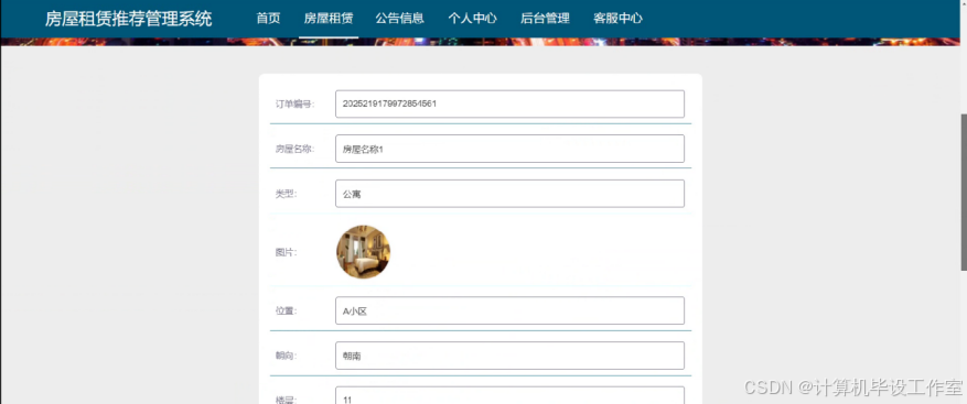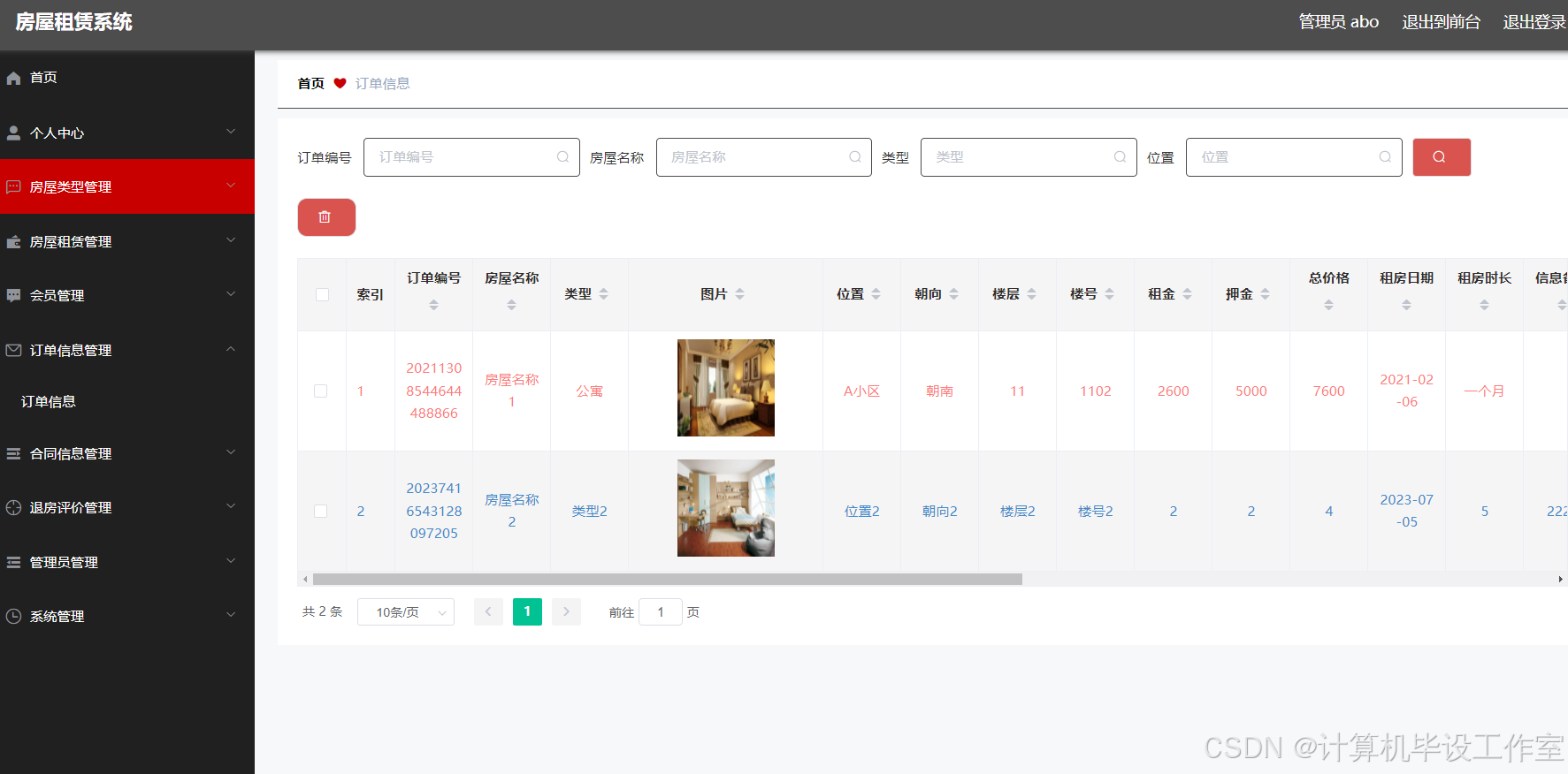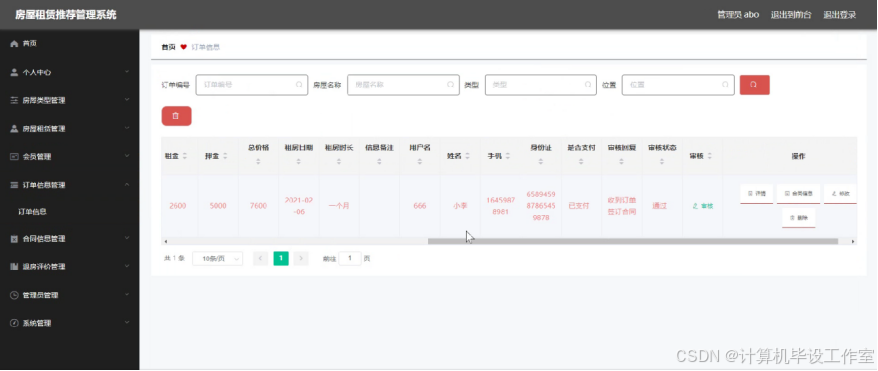 e)订单信息管理:管理员点击订单管理功能后,可以全面查看和跟踪所有租赁订单的状态,全流程一目了然。允许管理员详细检查每个订单的具体信息,包括租户资料、房源详情、租赁期限及支付状态。