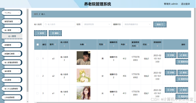养老院管理系统(源码+数据库+论文+答辩ppt一整套齐全)java开发springboot+vue框架javaweb,可做计算机毕业设计或课程设计