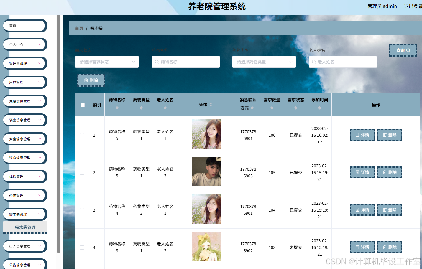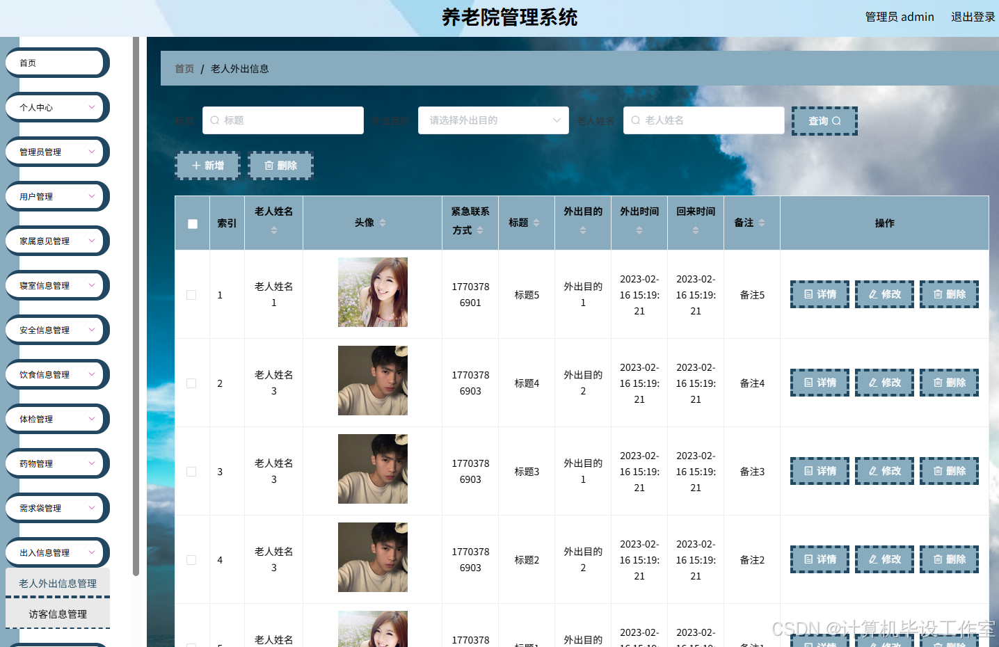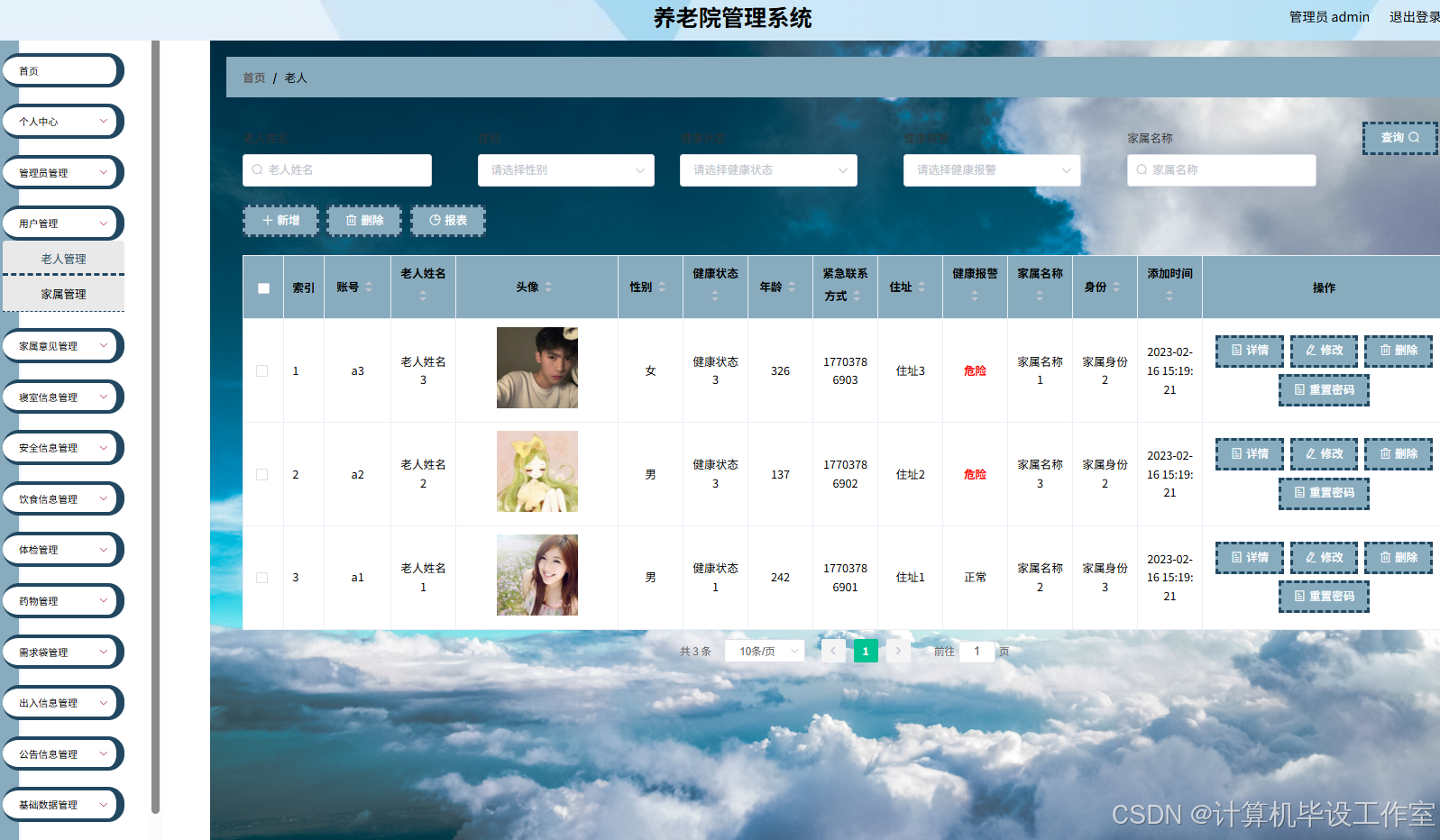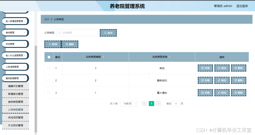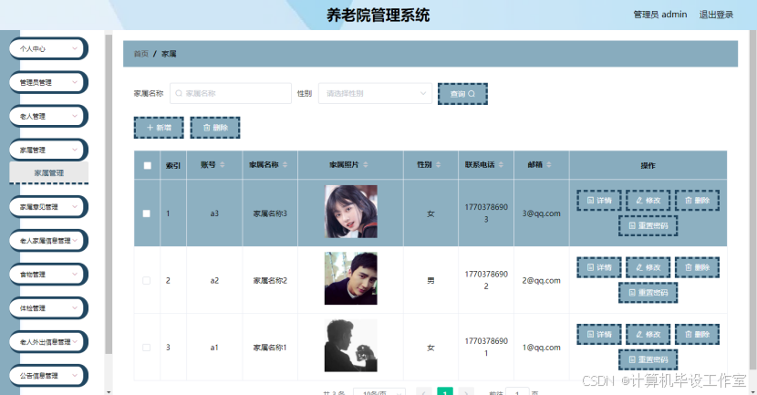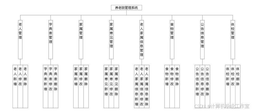 (3)管理员功能:老人管理、家属意见管理、寝室管理、安全信息管理、饮食管理、体检管理、药物管理、出入信息管理、公告信息管理等功能