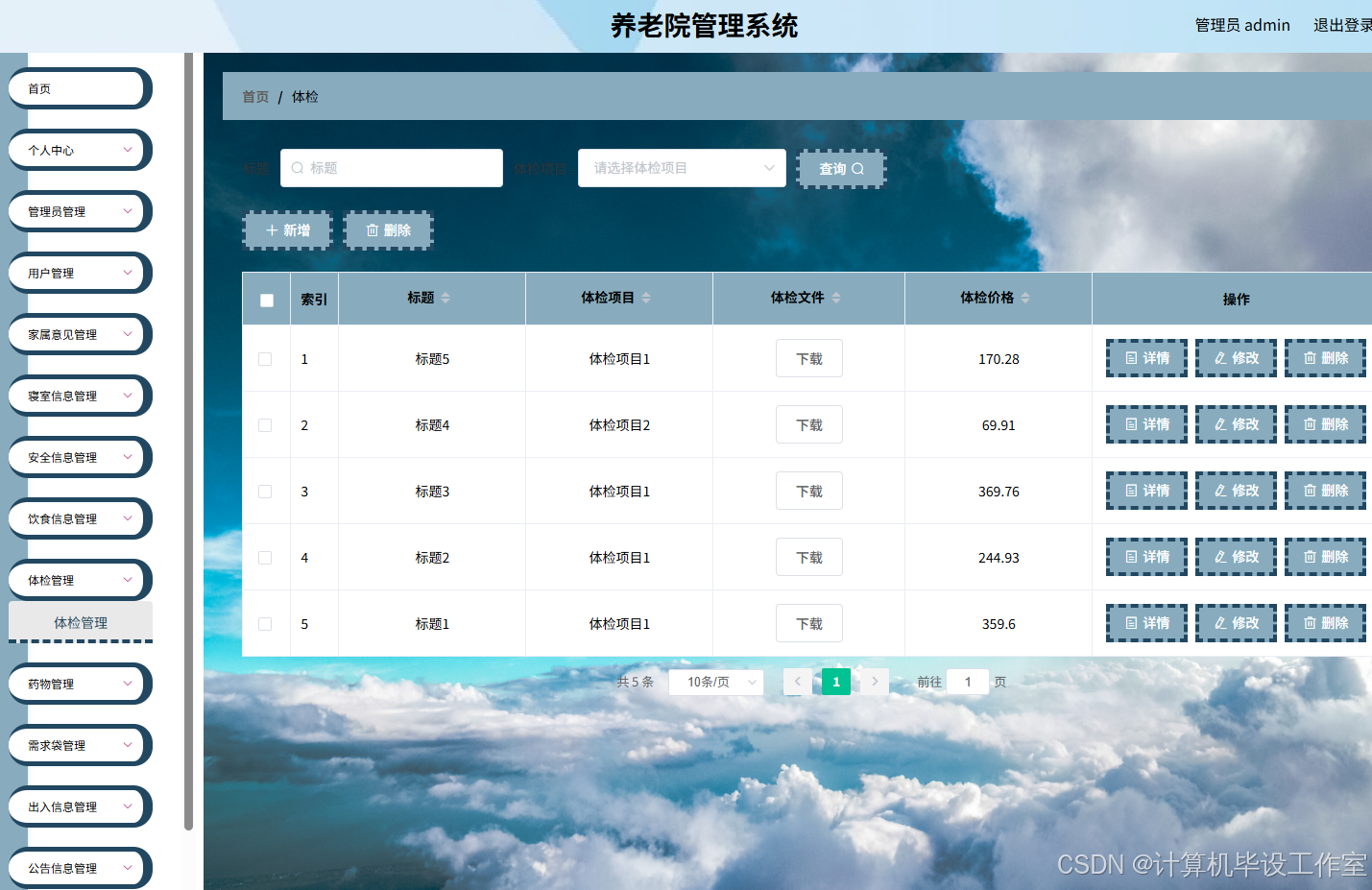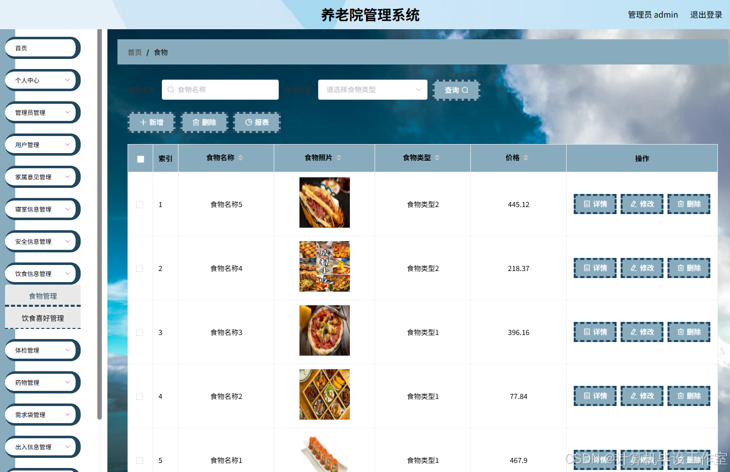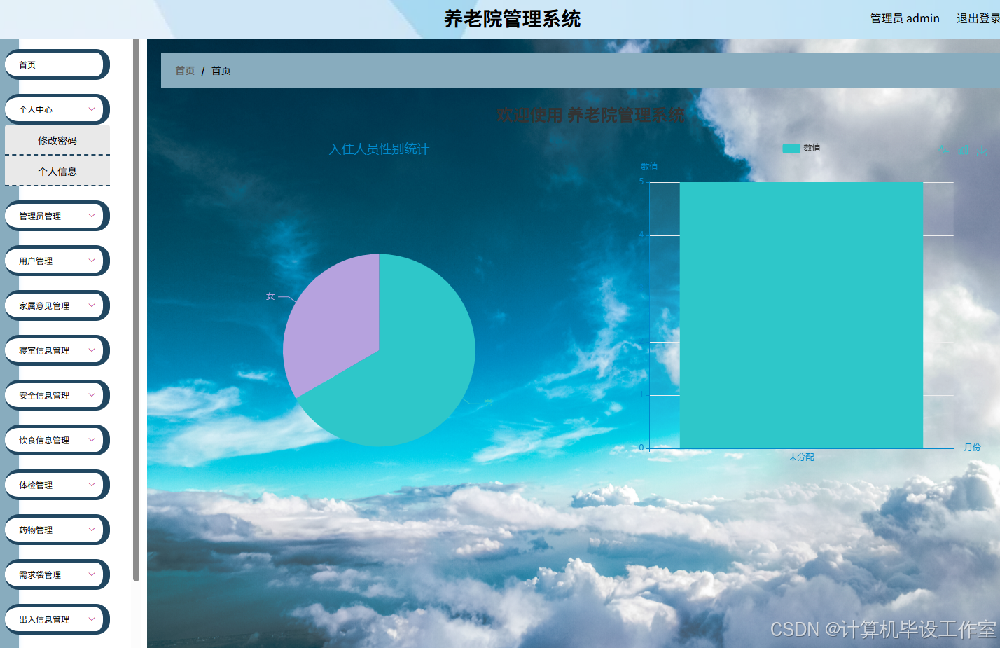 (3)管理员功能:老人管理、家属意见管理、寝室管理、安全信息管理、饮食管理、体检管理、药物管理、出入信息管理、公告信息管理等功能