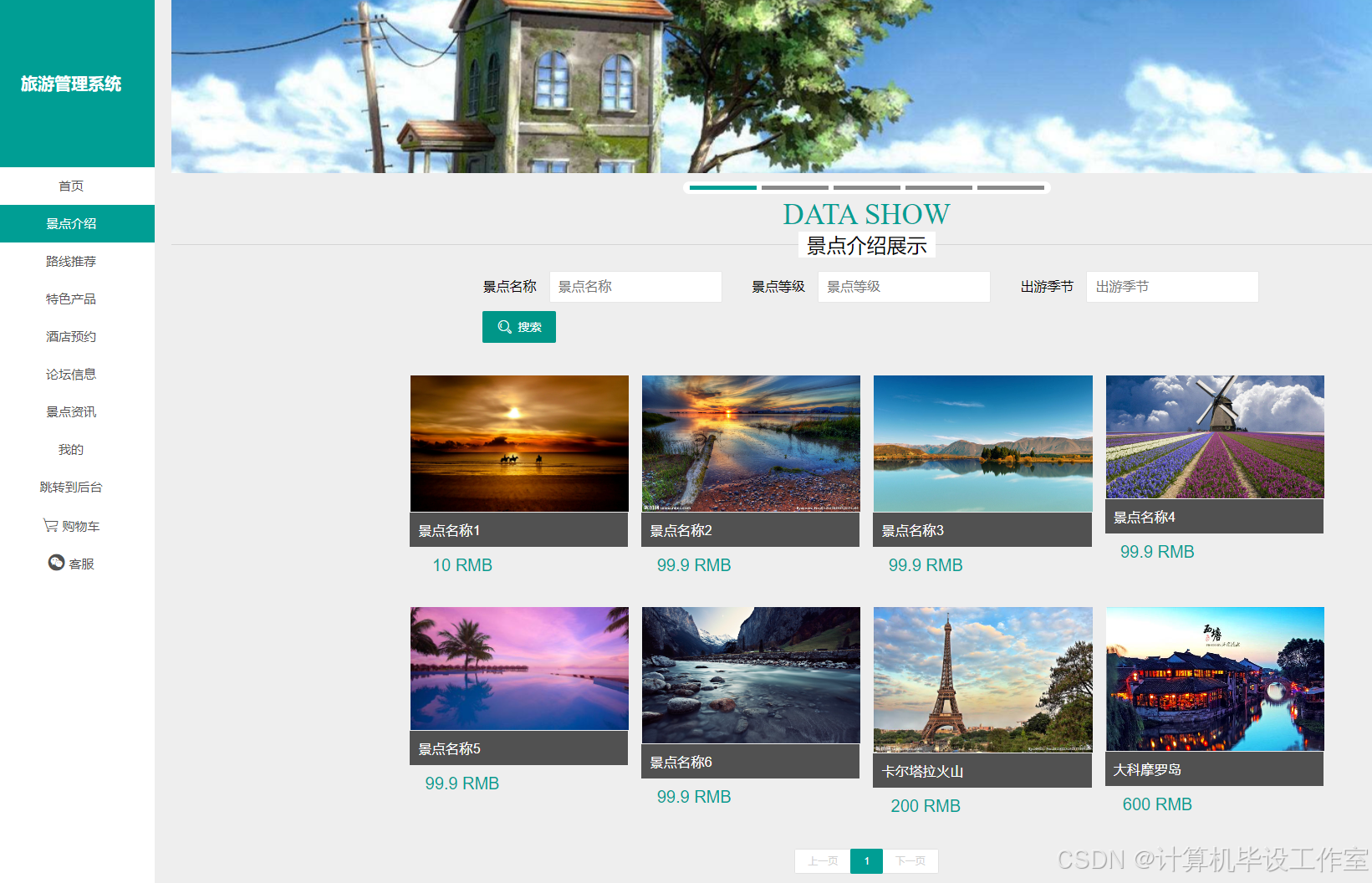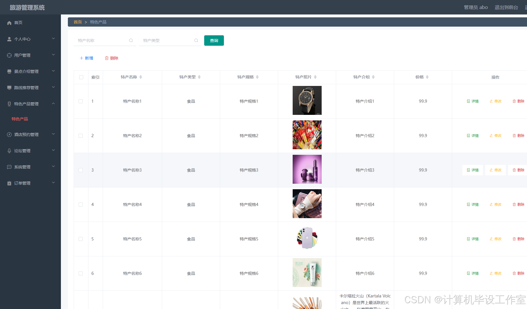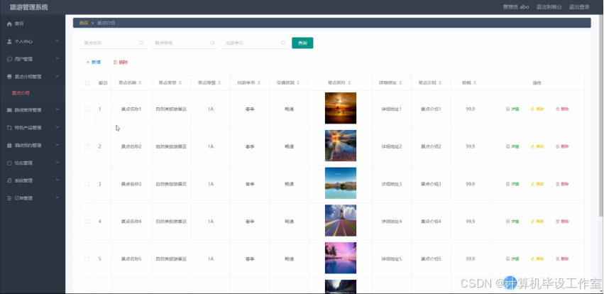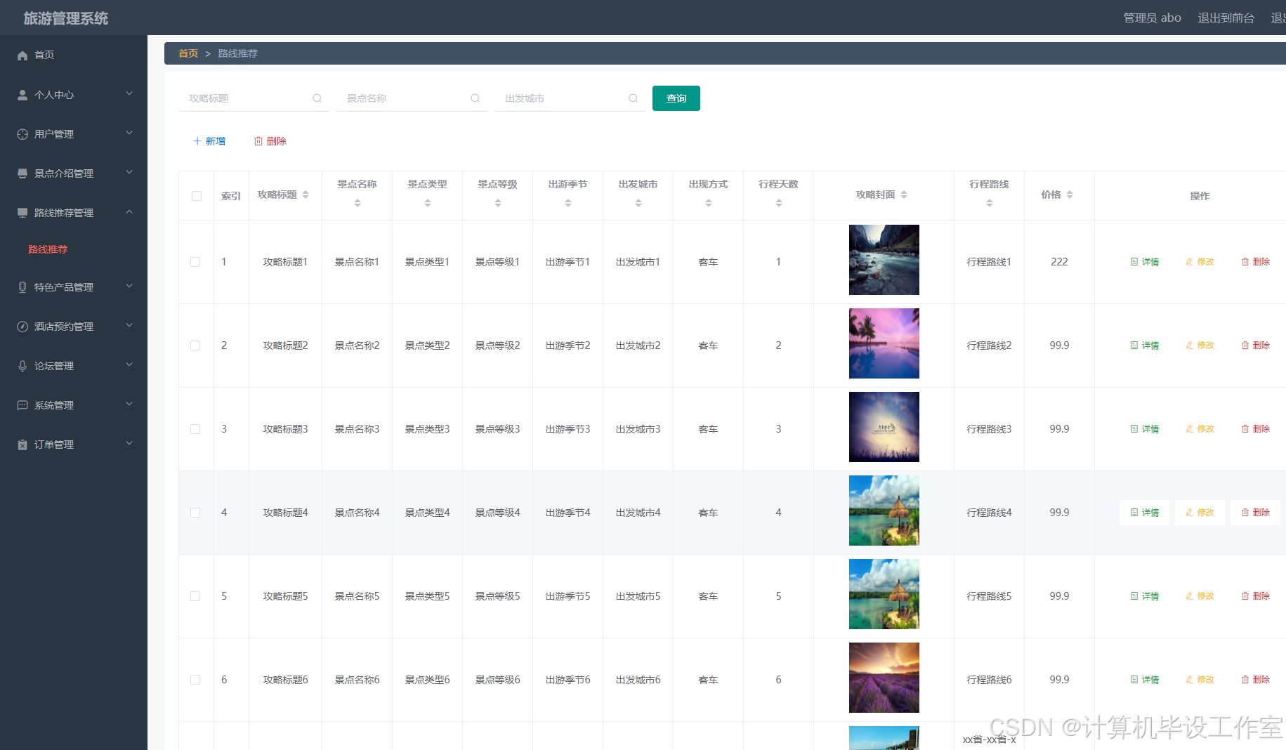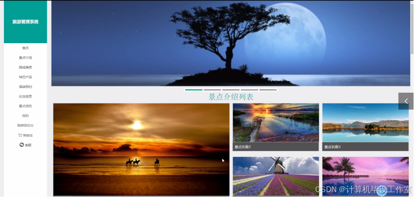 (1)功能要求:可以管理首页、个人中心、用户管理,景点介绍管理,路线推荐管理,特色产品管理、酒店预约管理、论坛管理、系统管理、订单管理等功能模块。