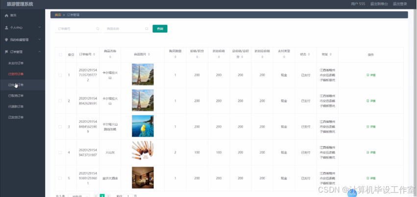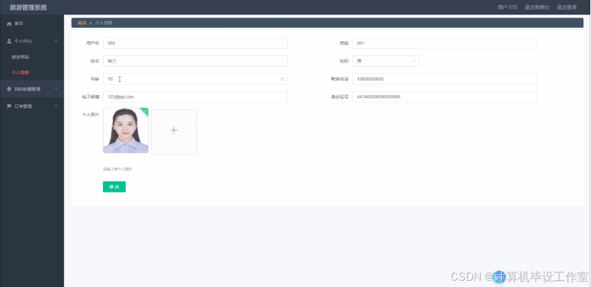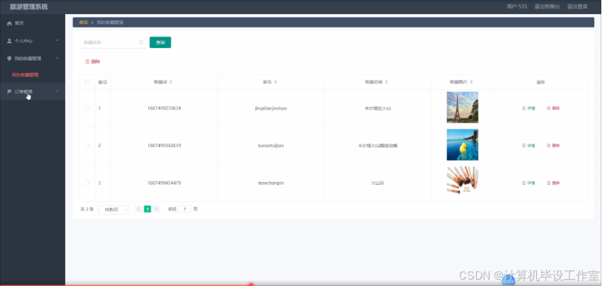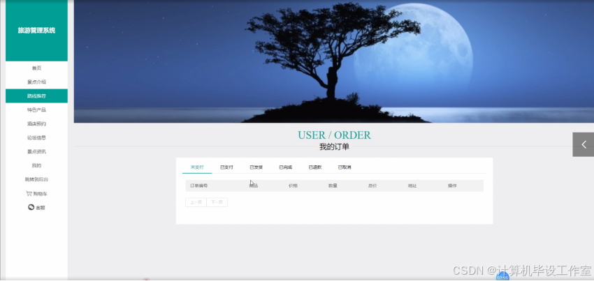 用户登录进入旅游管理系统可以查看首页、个人中心、我的收藏管理、订单管理等内容,如图5-15所示。