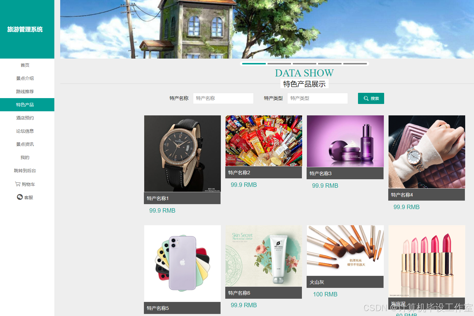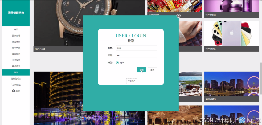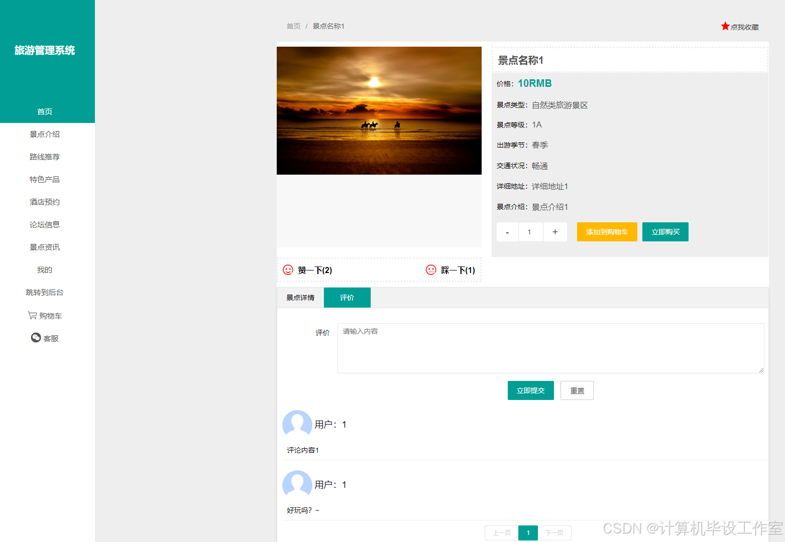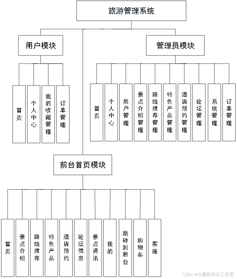用户前台;首页、景点介绍、路线推荐、特色产品、酒店预约、论坛信息、景点资讯、我的、跳转到后台、购物车、客服,
