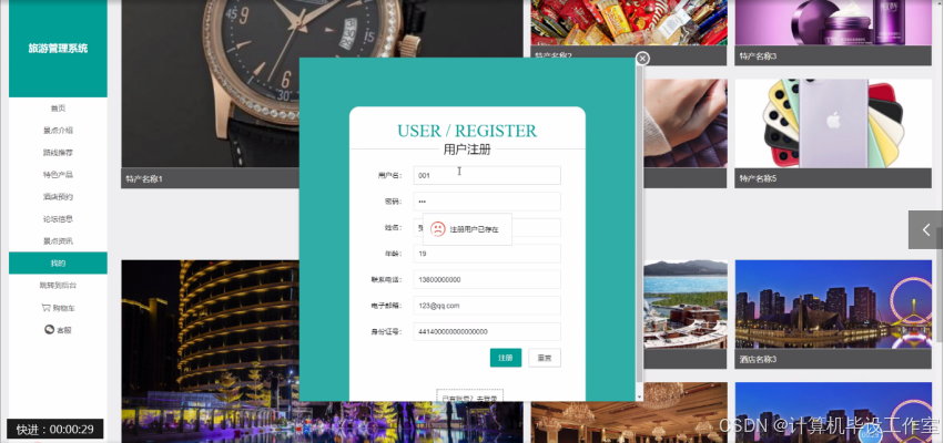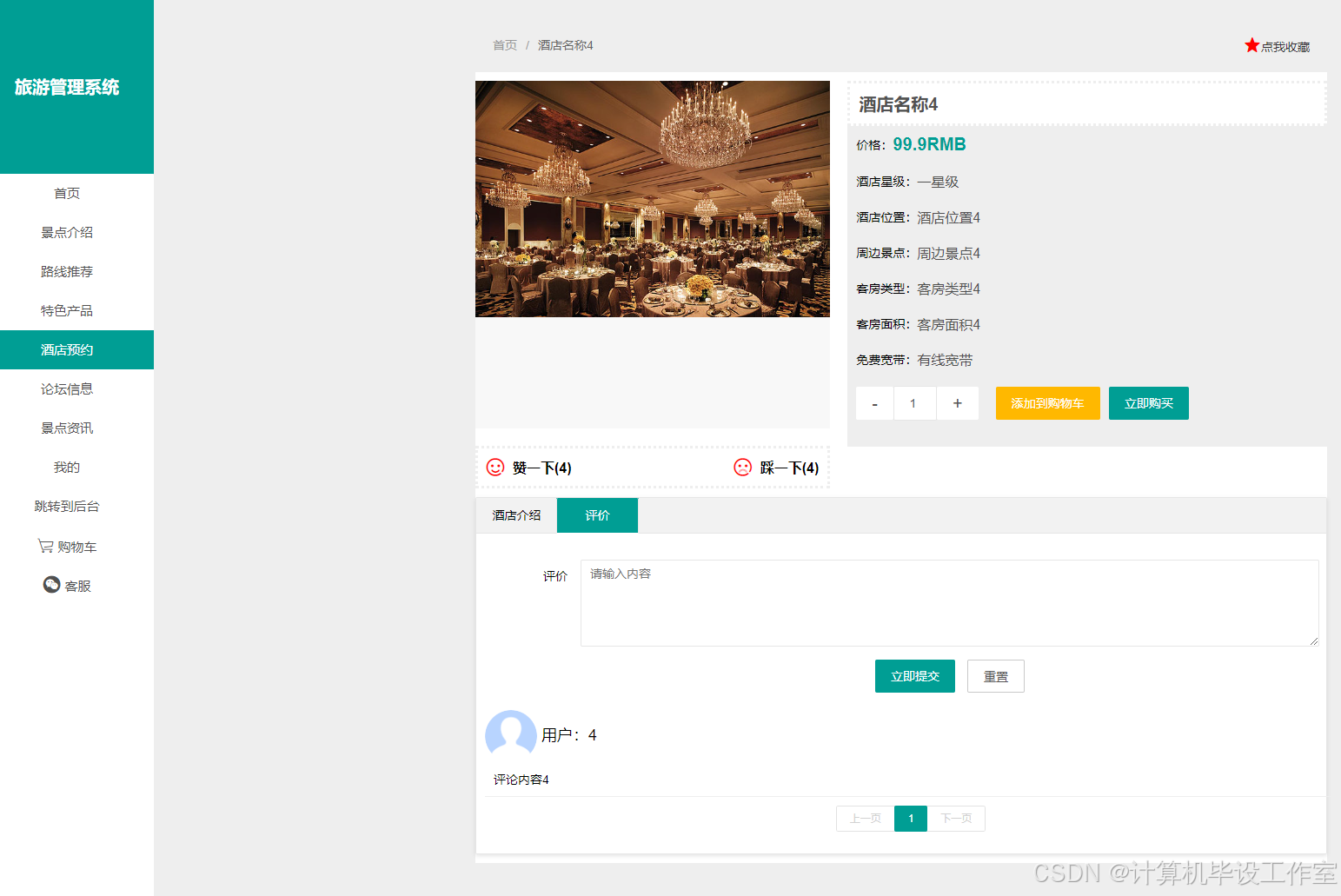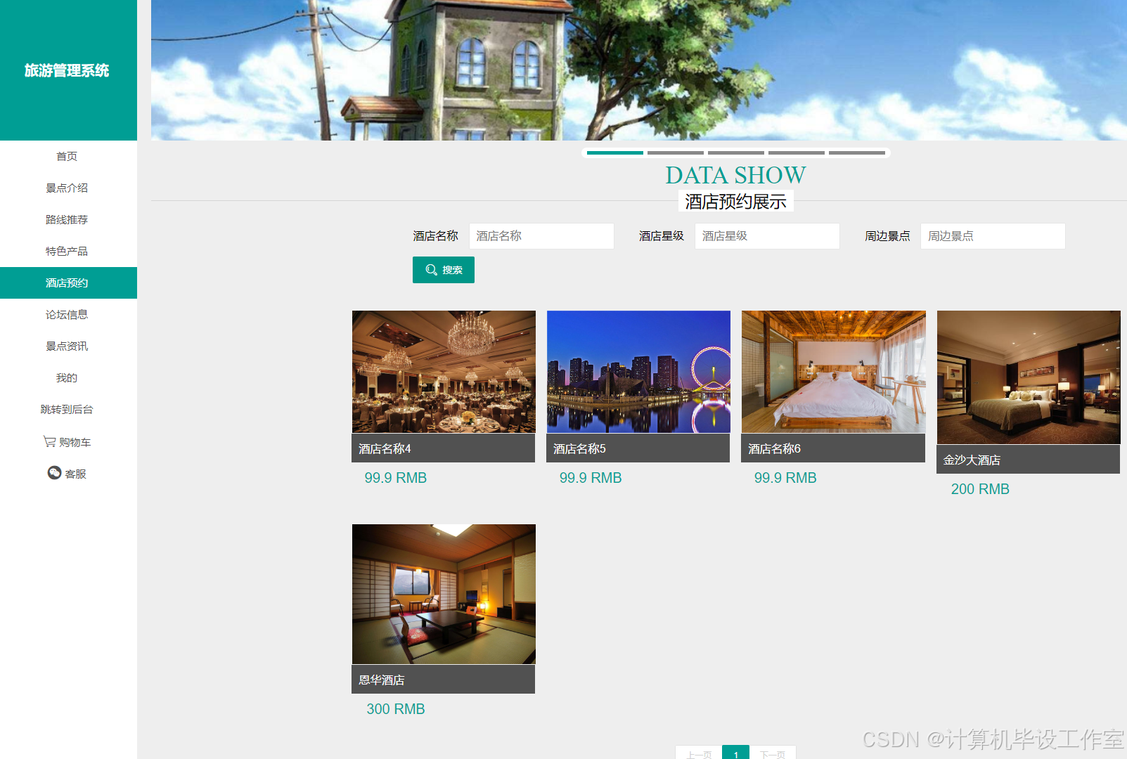 用户前台;首页、景点介绍、路线推荐、特色产品、酒店预约、论坛信息、景点资讯、我的、跳转到后台、购物车、客服,