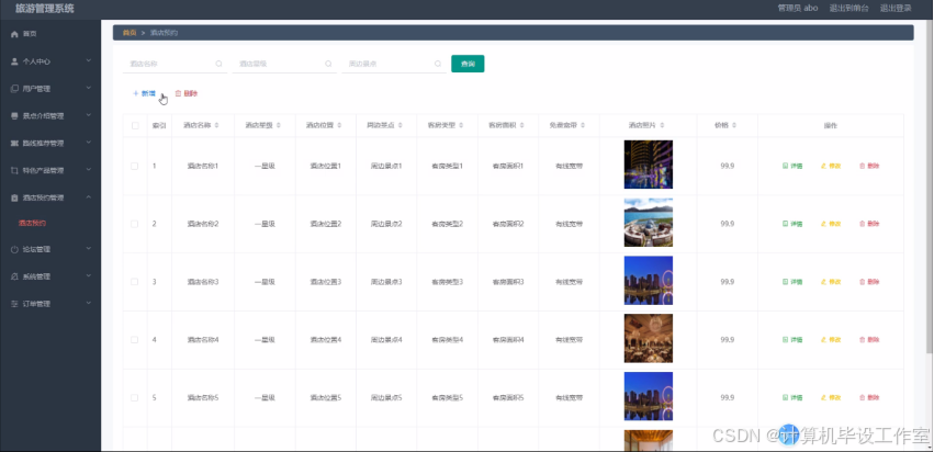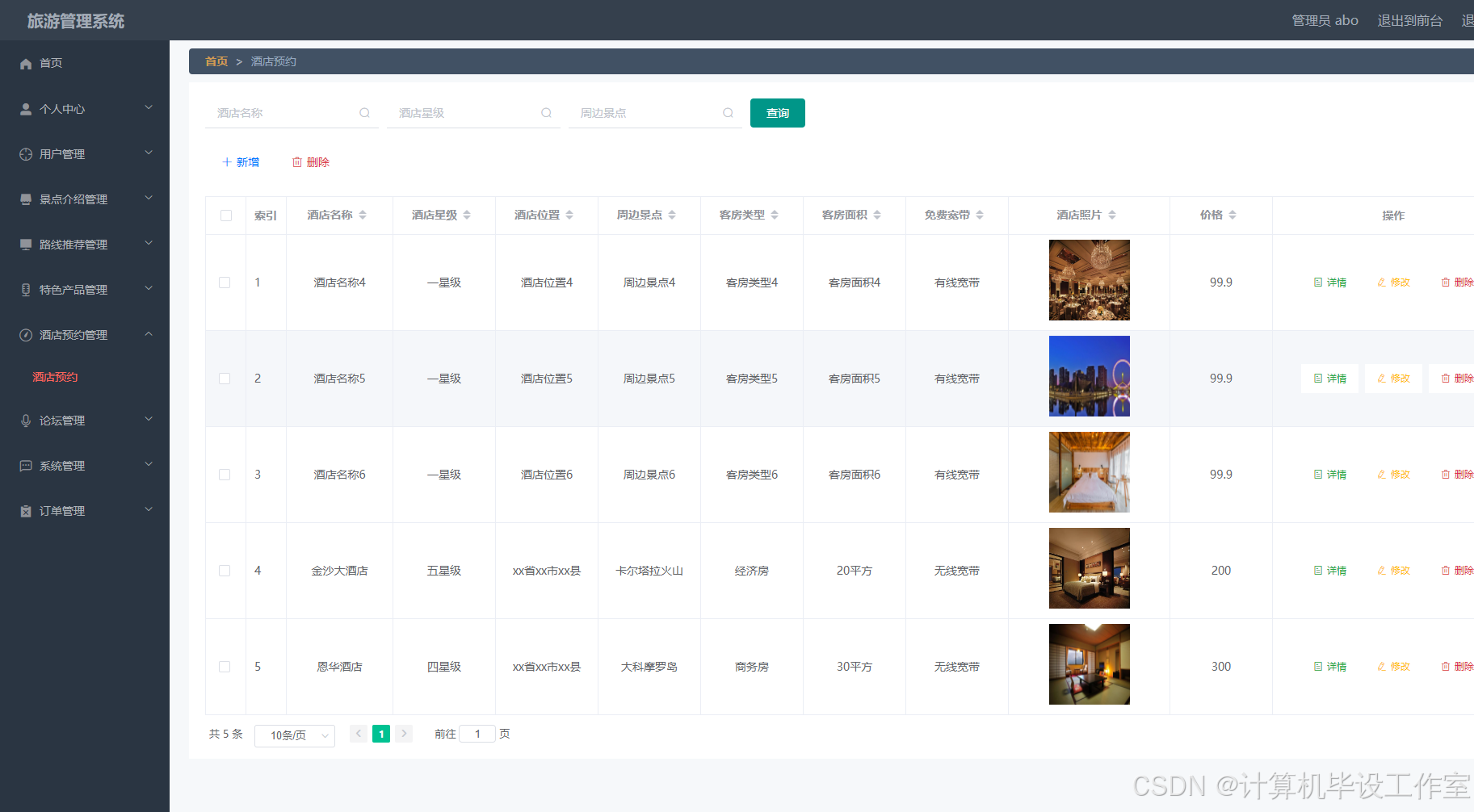 酒店预约管理,在酒店预约管理页面可以查看酒店名称、酒店星级、酒店位置等信息,并可根据需要对酒店预约管理进行详情,修改,删除或查看详细内容等操作,如图5-13所示。
