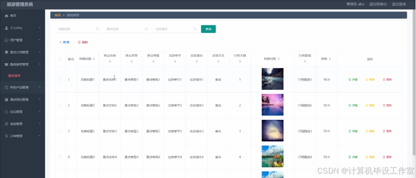 路线推荐管理,在路线推荐管理页面可以查看攻略标题、景点名称、景点类型、景点等级、出发城市等信息,并可根据需要对路线推荐管理进行详情,删除或查看详细内容操作,如图5-11所示。