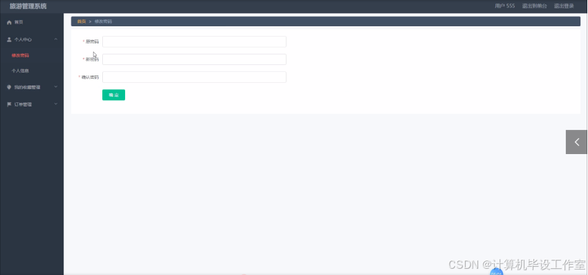 个人中心,在个人中心页面可以填写原密码、新密码、确认密码进行修改如图5-16所示。