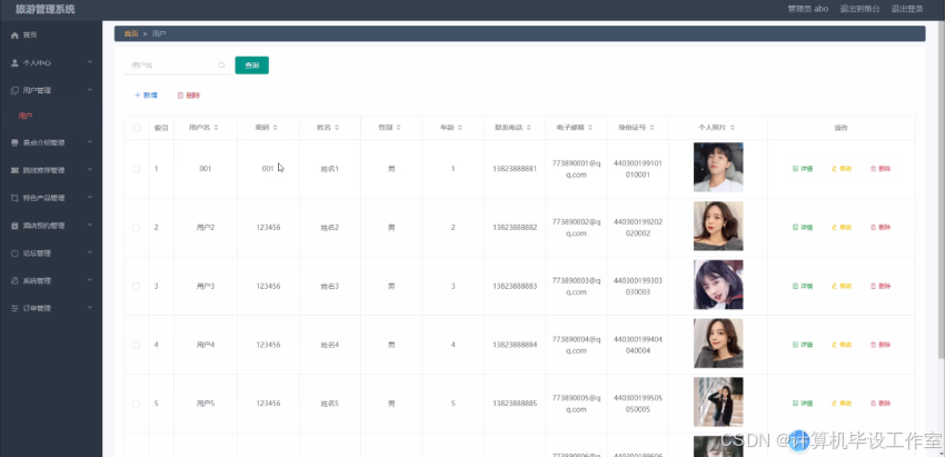 用户管理,在用户管理页面可以查看用户名、密码、姓名、性别、年龄、联系电话、电子邮箱、身份证号、个人照片等信息,并可根据需要对用户管理进行详情,修改,删除或查看详细内容等操作,如图5-9所示。