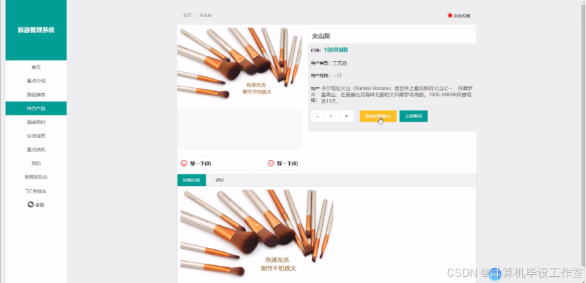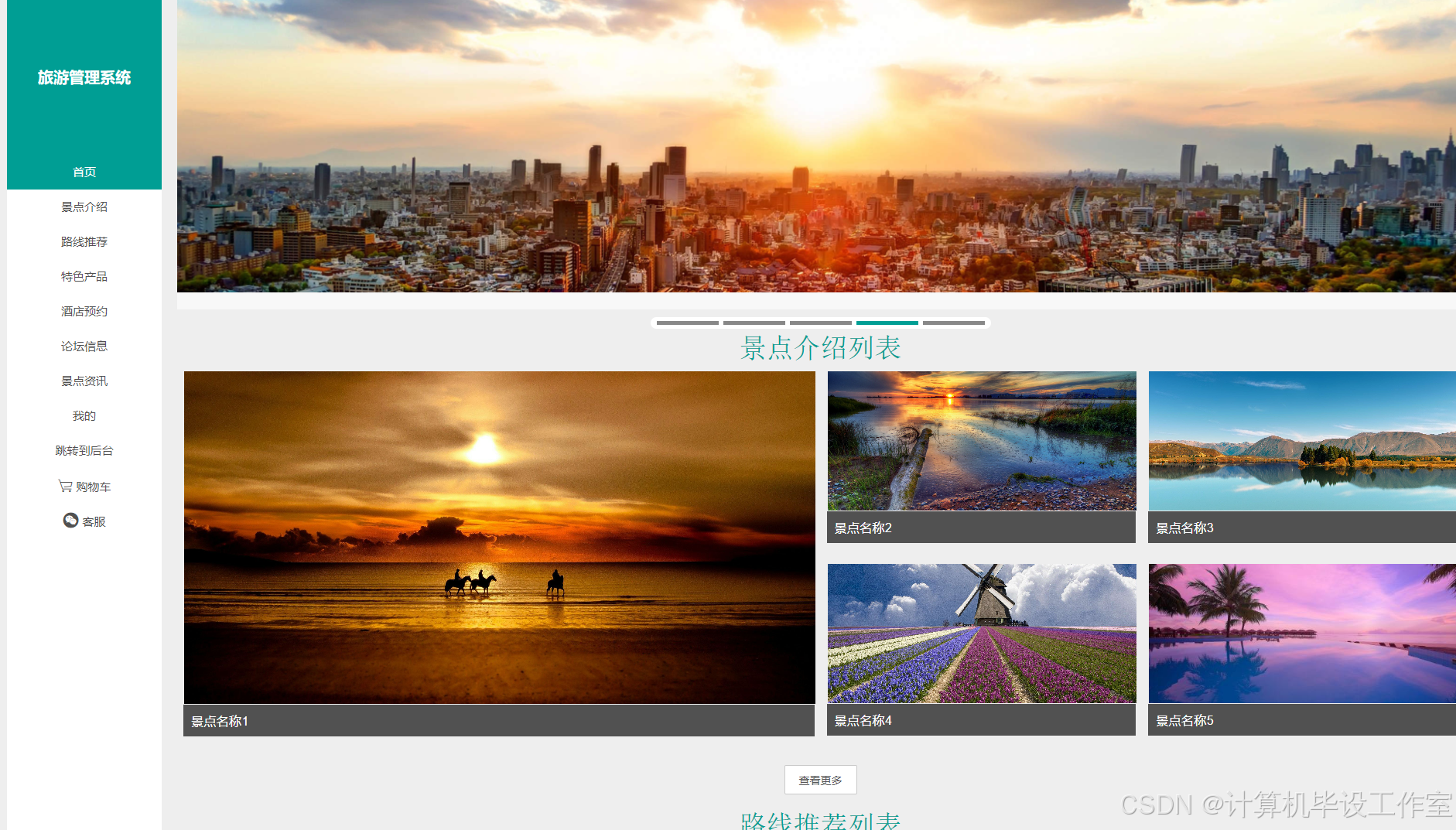 (1)用户功能:首页、景点介绍以及预约、路线推荐、特色产品、酒店预约、论坛信息、景点资讯、我的、跳转到后台、购物车、客服咨询等功能