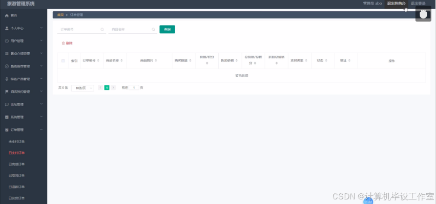 3、功能的完善性:可以管理;管理员;首页、个人中心、用户管理,景点介绍管理,路线推荐管理,特色产品管理、酒店预约管理、论坛管理、系统管理、订单管理,