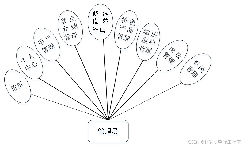 (2)管理员功能:用户管理,景点介绍管理,路线推荐管理,特色产品管理、酒店预约管理、论坛管理、系统管理、订单管理、在线回复等功能