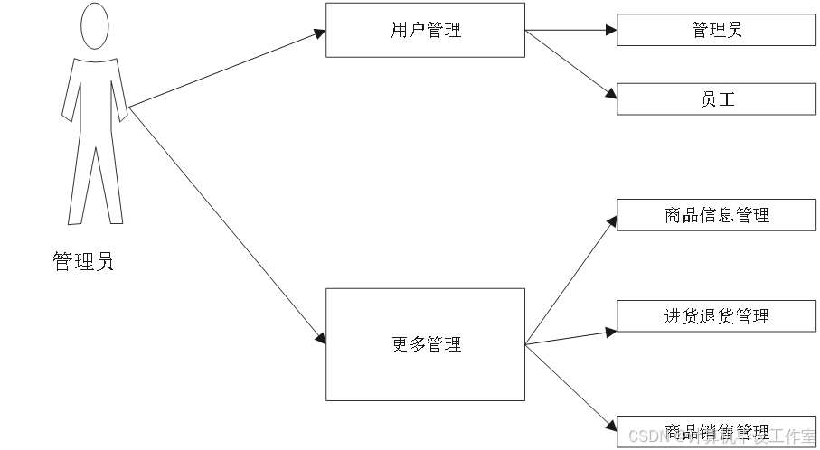 管理员所能使用的功能主要有:首页、用户管理(管理员、员工)更多管理(商品信息、商品进货、商品退货、销售信息、商品分类)等。