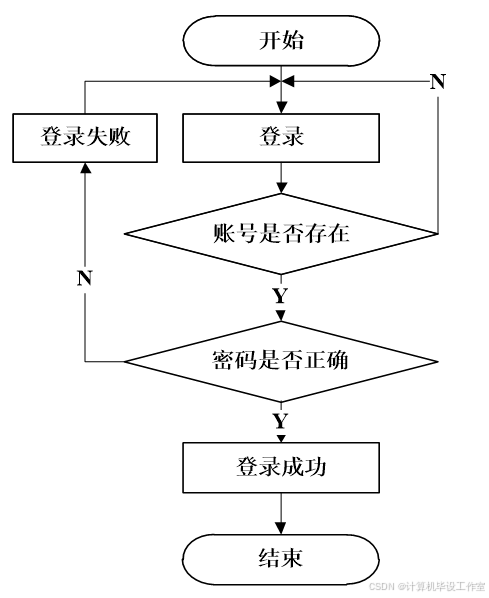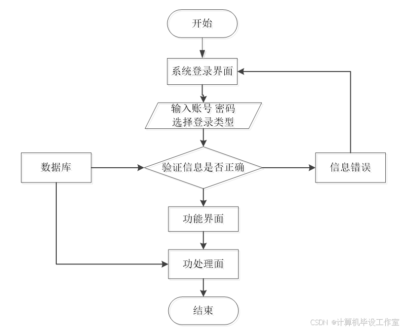 用户想进入系统,首先进入系统登录界面,通过正确的用户名、密码,选择登录类型登录,系统会检查登录信息,信息正确,然后输入相应的功能界面,提示信息错误,登录失败。系统操作流程如图3-4所示。