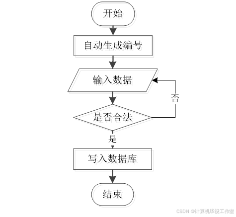 添加信息,编号系统使用自动编号模式,没有用户填写,用户添加信息输入信息,系统将自动确认的信息和数据,验证的成功是有效的信息添加到数据库,信息无效,重新输入信息。添加信息流程如图3-3所示。
