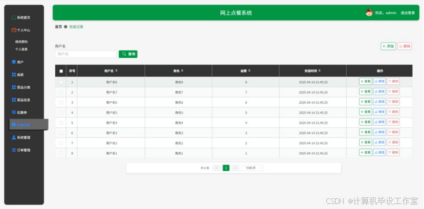 在充值记录界面,管理员可以查看、管理用户在系统的充值余额记录和详情。充值记录界面如下图所示: