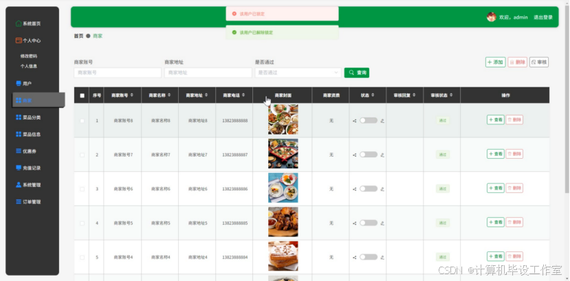 - 商家:管理员可以进行查看系统所有的商家账号信息,并可进行删除、添加等操作。另外,对新注册的商家进行审核处理。