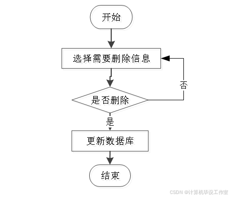 用户选择需要删除的记录后,系统判断是否确认删除。若未确认,返回选择环节;若确认删除,则更新数据库,删除对应记录,完成操作后流程结束。如图所示: