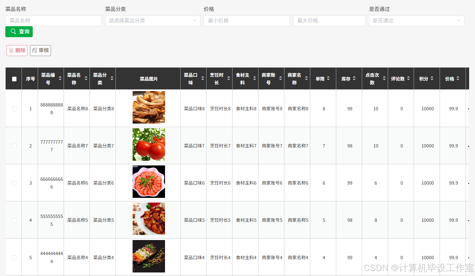 - 菜品信息:菜品信息列表,可以查看、管理菜品信息及其评论,并对商家新提交的菜品信息进行审核。
