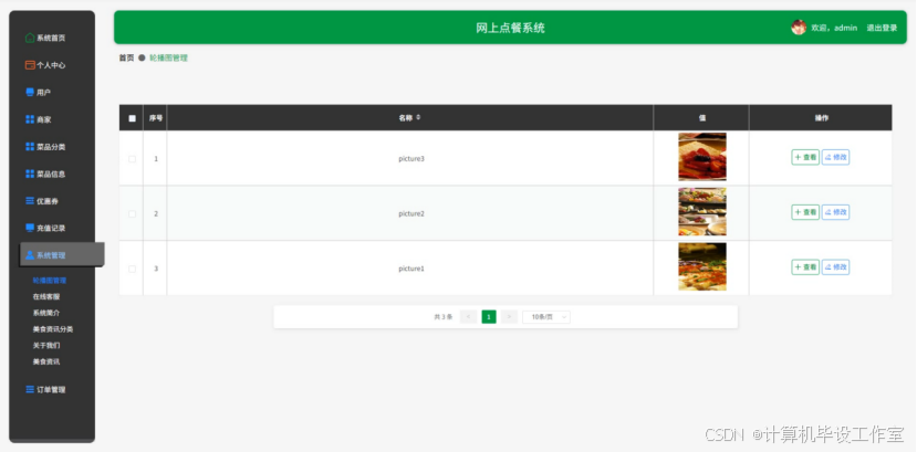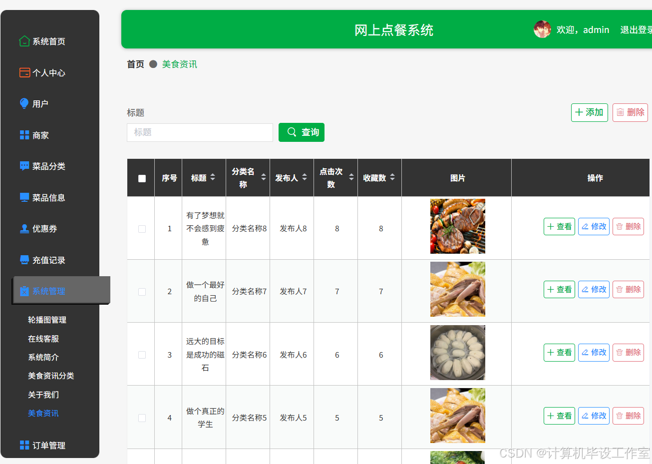 - 系统管理:此模块包含轮播图管理、在线客服、系统简介、美食资讯分类、关于我们和美食资讯,管理员可以查看、修改轮播图、系统简介和关于我们,也可以对美食资讯分类和美食资讯进行增删改查操作。可以查看、回复用户发送的信息。