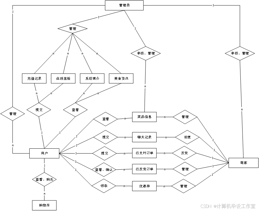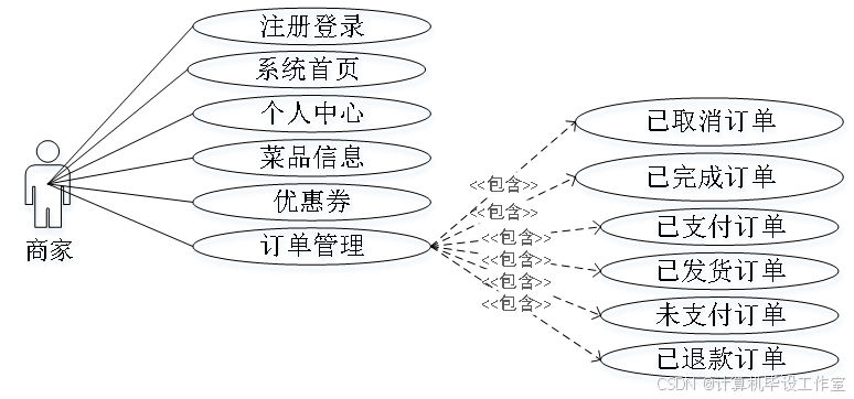通过对网上点餐系统的功能需求分析,系统划分为了用户、商家和管理员三大角色。