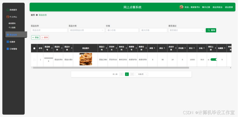 菜品信息管理界面,商家可以查看自己发布的菜品信息及其评论,可进行菜品信息的添加,需经管理员审核同意才能在前台显示,也可修改和删除菜品信息。菜品信息界面如下图所示: