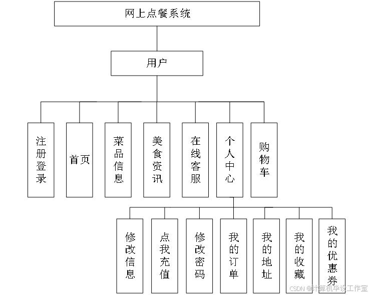 系统功能模块设计是系统开发过程中的重要阶段,它旨在将系统划分为不同的模块,每个模块负责完成特定的功能或任务。网上点餐系统由前台和后台两大功能模块组成,每个模块下又包含具体的功能操作。前台功能模块图如下所示。