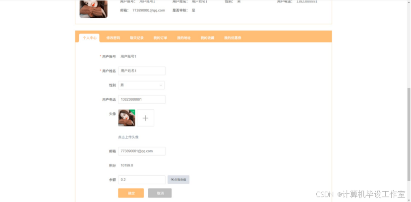在个人中心界面,用户可以查看、修改个人信息和密码,可以点我充值,选择支付方式进行余额的充值;在聊天记录可查看自己咨询商家的信息记录及回复情况;查看管理我的订单,跟踪订单配送情况,及时确认收货等;可以查看和管理我的地址、我的收藏;可以查看领取的优惠券和使用情况。个人中心界面如下图所示: