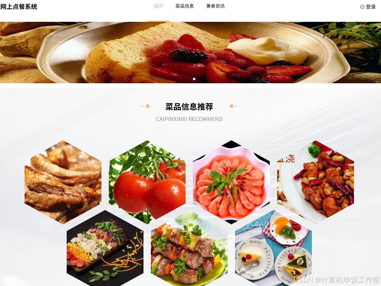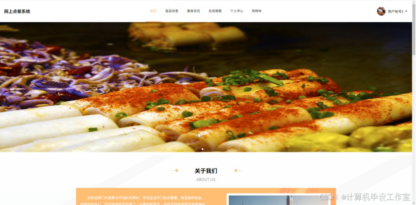 - 首页:用户登录系统进行首页界面,首页主要展示轮播图以及各大功能板块,功能导航栏在系统界面直上方,用户可见公告信息、系统简介和菜品信息推荐等,系统集成协同过滤推荐算法,可以根据用户偏好进行智能推荐。