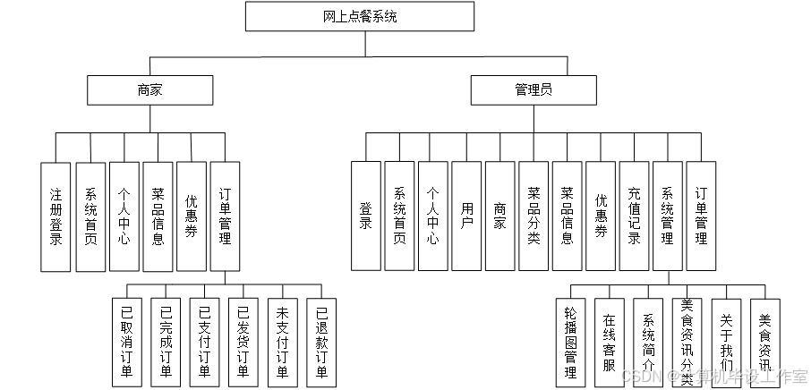 (3)管理员,则提供全面的后台管理功能,包括用户和商家的账号管理、菜品分类、菜品信息、优惠券、充值记录、系统管理和订单管理等,确保网上点餐系统的健康运行和内容的及时更新。