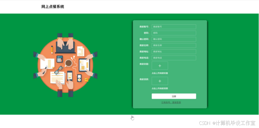 商家注册时,系统要求其提供必要的信息,例如商家账号、密码、商家名称、商家地址、电话和上传商家资质等。注册过程完成后,需由管理员审核同意才可登录系统后台。商家注册界面如下图所示: