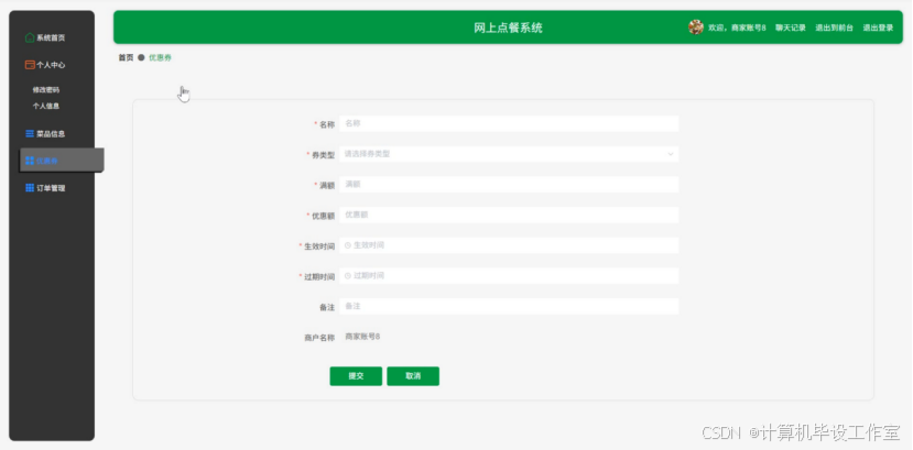 - 优惠券:商家可以发布、管理优惠券,促进自己的菜品销售。