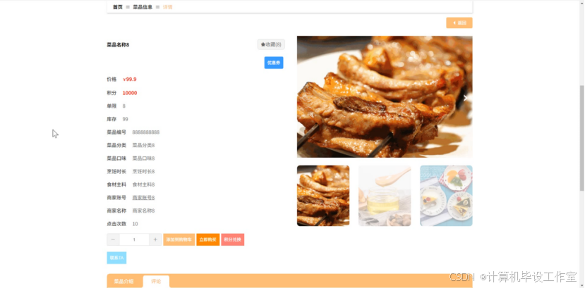 在菜品信息界面,用户可以浏览菜品信息列表,可按关键词、价格、销量等条件搜索菜品,也可按菜品分类浏览菜品信息,选择点击菜品,可查看菜品详情,包含图片、价格、描述、评价等信息,可领取商家发布的优惠券、收藏菜品和加入购物车;用户可以点击联系TA按钮,与商家进行实时沟通,咨询订单问题、菜品信息、活动详情等。另外订单完成之后可以在评论区进行评论。菜品信息详情界面如下图所示: