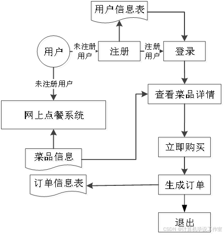 业务流程图既反映了内部业务间的相互联系,又反映了菜品信息和订单情况。网上点餐系统须支撑整个机构不同层面的多种职能,而各功能模块间存在着多种关联信息,组成一个有机整体,并针对网上点餐系统自身特点和面临的现实条件,对系统进行业务流程图设计。系统通过流程的顺畅和高效,实现了用户便捷购买菜品的需求和系统管理的便捷,提升了系统的运行效率和用户体验。如图所示: