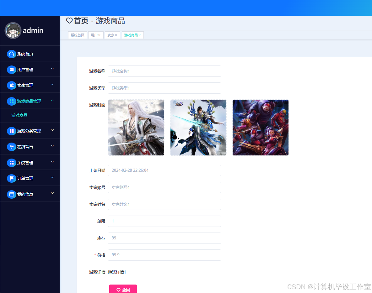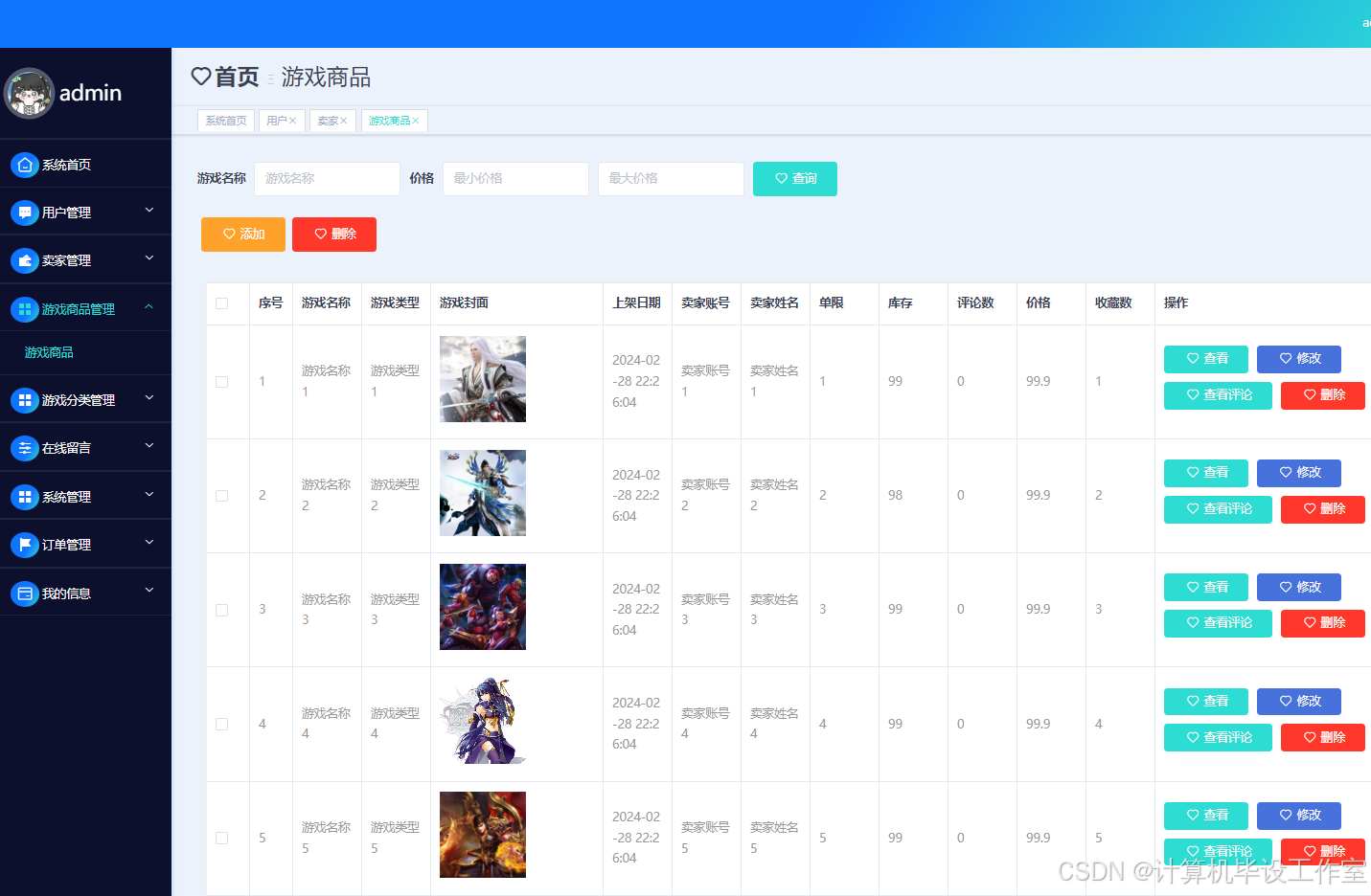 通过游戏商品管理页面,可以输入游戏名称+游戏类型+卖家信息+价格+游戏封面+上架日期+单限+库存+游戏详情等信息,并且可以对游戏商品信息进行增删改查操作,如图5-9所示