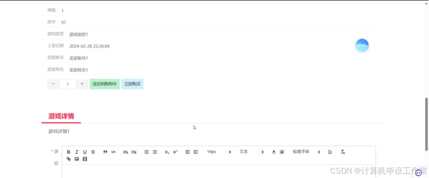 游戏商品页面可以查看游戏名称+游戏类型+卖家信息+价格+游戏封面+上架日期+单限+库存等信息,并可对商品进行收藏、点赞以及评论等操作。如图5-5所示。