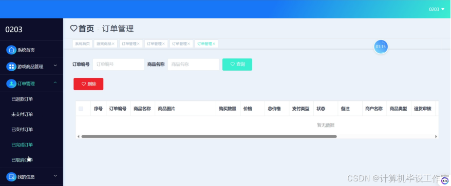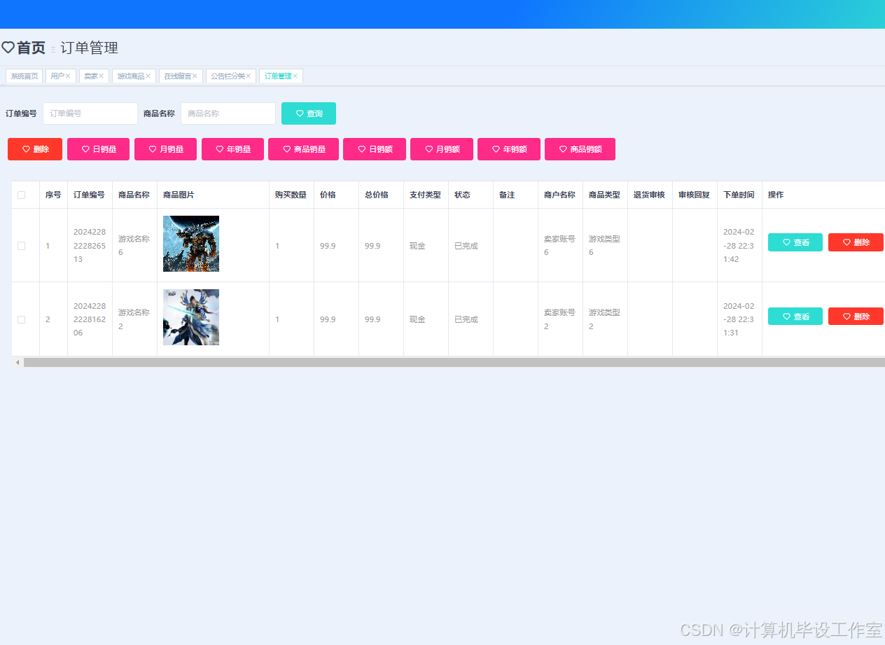 卖家用户可以查看到前台用户购买游戏商品的订单信息,查看订单状态、付款详情等,卖家用户进行审核,订单信息管理界面如下图5-10所示。