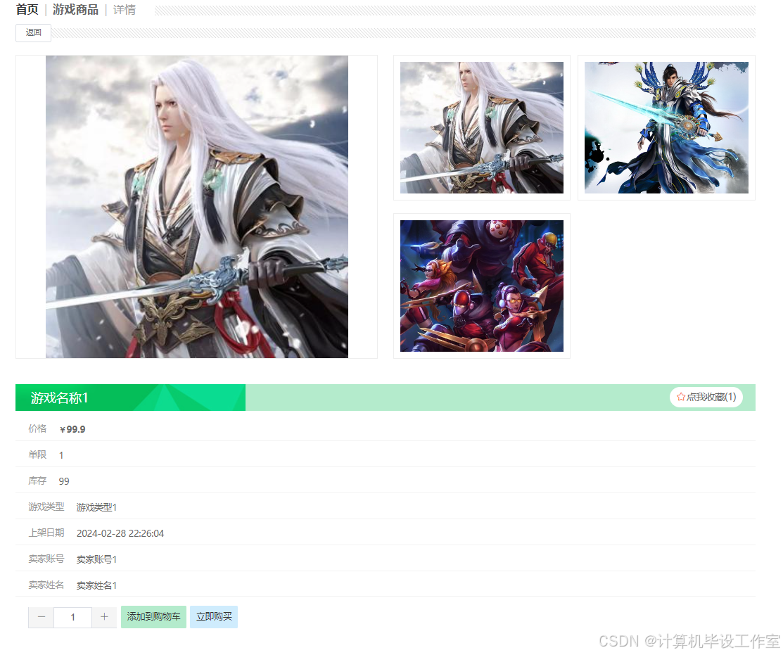 游戏商品详情功能主要是可以查看游戏商品的详情信息,并且可以查看卖家信息,在用户没有登陆的情况是无法查看到卖家信息的,但是可以查看商品的信息,用户只有完成登陆才能去查看卖家的信息,此时用户可以将喜欢的游戏商品加入关注,或者是进行在线支付购买