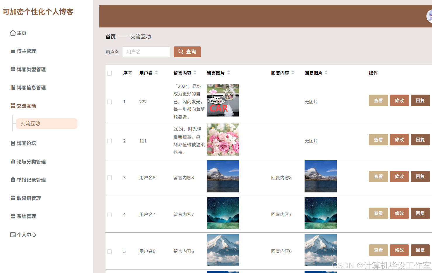 在当今数字化时代,个人博客平台不仅是表达自我、分享见解的重要渠道,也是建立个人品牌和社群交流的有效工具。但是,随着网络环境的日益复杂,有关个人隐私保护,信息安全和内容健康成为了构建博客时必须考虑的重要因素。因此,设计一款基于Web的可加密个性化个人博客。该平台通过Springboot框架保证系统高效和稳定的同时,采用MD5算法对用户密码进行加密处理,确保账户安全;通过屏蔽敏感词及应用脱敏算法来过滤不当言论,维护健康的交流环境。平台可以实现多种功能,包括但不限于交流互动、博客信息发布、举报记录管理以及资讯信息展示等。允许用户自由发布博客信息,分享生活点滴、专业知识或兴趣爱好等内容,还鼓励用户之间的积极互动,如评论、点赞等,促进了知识的传播与思想的碰撞。此外,为了维护良好的社区氛围,系统内置了举报机制,使用户能够针对不适当的内容或行为进行举报。