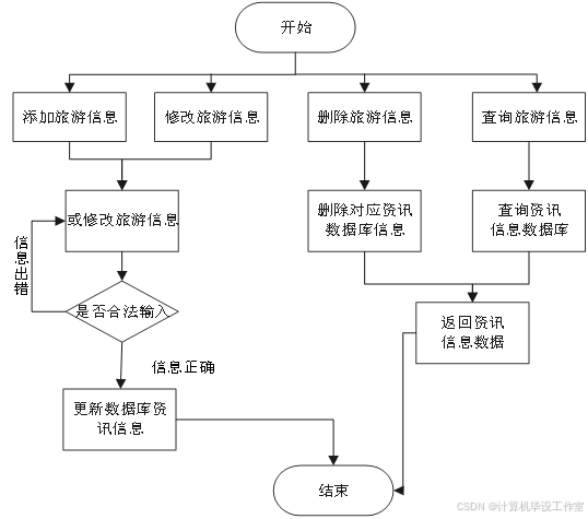 旅游资讯管理模块是基于Web的可加密个性化个人博客的主要模块,管理员可以对旅游资讯进行增删改查,添加新的旅游资讯、修改旅游资讯、删除旅游资讯、查询旅游资讯等,管理员输入的旅游资讯是否有误,如是否合法输入旅游资讯等,待后台检测数据无误后,系统会将管理员输入的数据写入数据库,当管理员删除和查找旅游资讯数据时,后台会根据输入的信息删除和显示对应旅游资讯的数据,具体流程图如图3-3。
