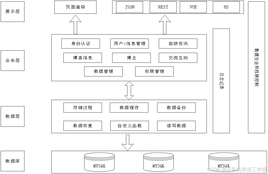 按照高内聚低耦合的原则,遵循易扩展、易维护的特点,将基于Web的可加密个性化个人博客从软件技术架构角度分为展示层、业务层、数据层、数据库等四个技术层次,如下图所示。