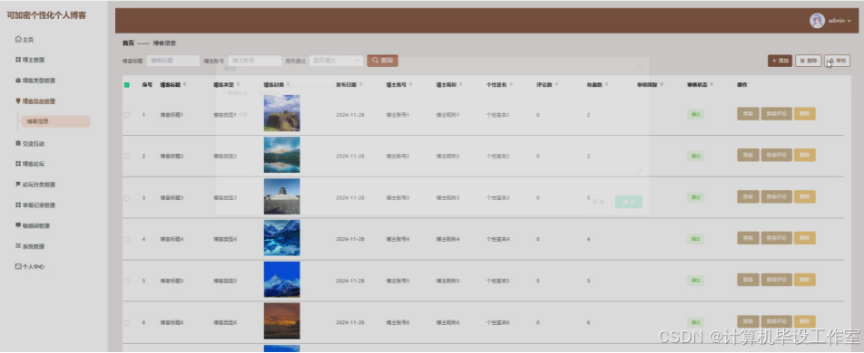 博主管理:此功能允许管理员查看和管理平台上的所有博主信息,包括审核新注册博主、编辑现有博主资料以及处理违规行为等。