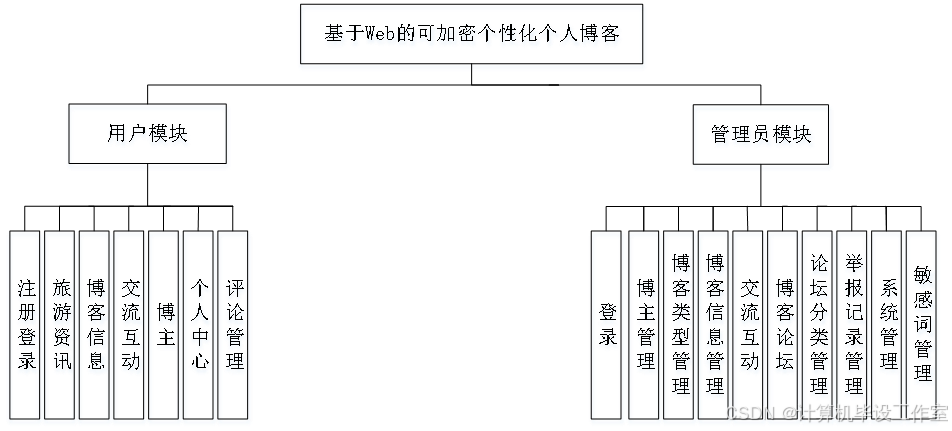 基于Web的可加密个性化个人博客共分为两个部分,一部分是面向前端用户的部分,包括:注册登录,旅游资讯、博主、博客信息、交流互动、博客论坛等功能。一部分是系统的后台管理员用户,管理员是系统的最高权限拥有者,主要功能包括博主管理、博客类型管理、交流互动、博客论坛、论坛分类管理、举报记录管理、敏感词管理、系统管理等功能。系统结构功能图如下图所示。