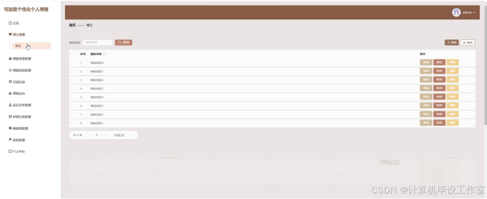 博客类型管理:管理员可以通过博客类型管理功能创建、修改或删除博客分类,帮助用户更好地组织和查找内容。