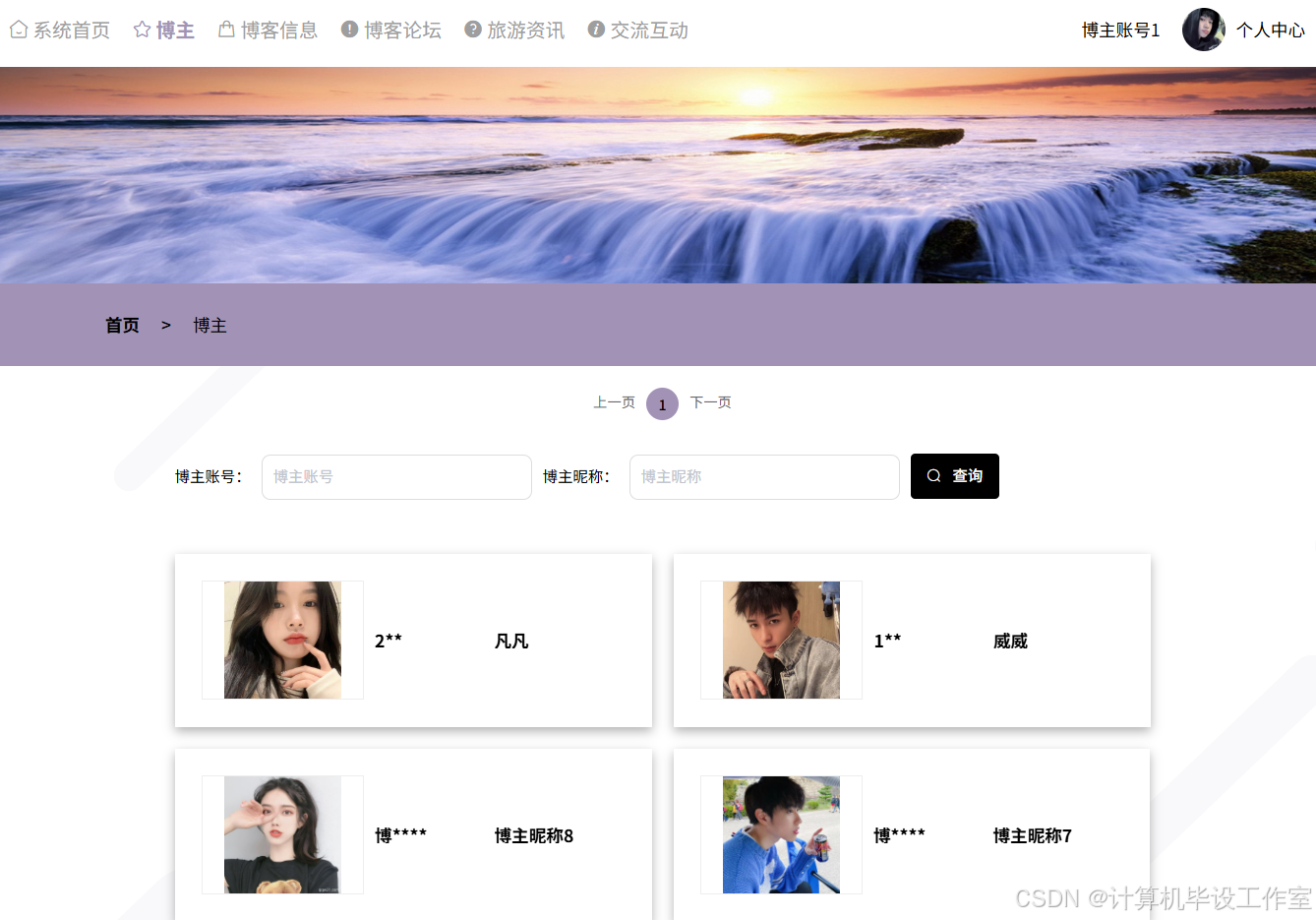 用户在前端的博主界面中,可以直观地查看不同主题博主的具体信息,并允许用户根据兴趣添加好友,促进社区内的互动交流。通过关注不同的博主,用户可以及时获取感兴趣的内容更新。
