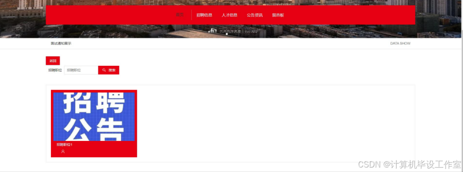 (2)首页:用户登录系统后跳转至首页界面,导航栏下面依次是轮播图、公告资讯、留言板、招聘信息等。