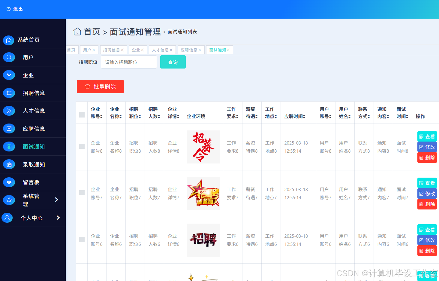 (7)面试通知:管理员可以查看企业发布的面试通知,对所有的面试数据进行维护管理。