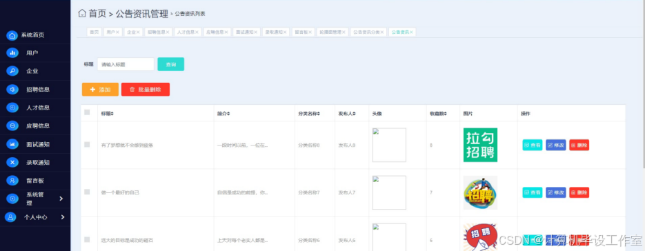 - 人才信息:管理员对多有的人才信息列表进行管理,可以输入关键字进行搜索查找。