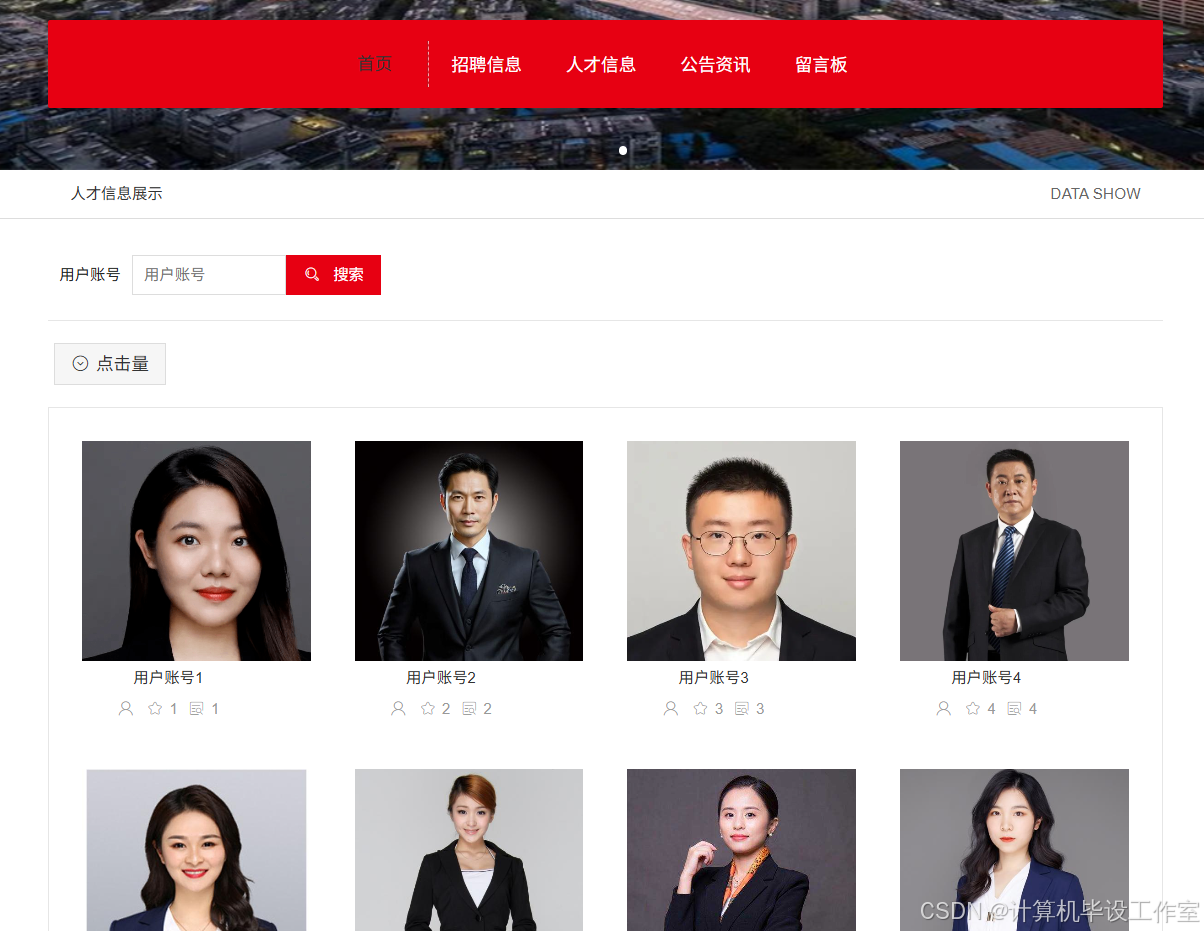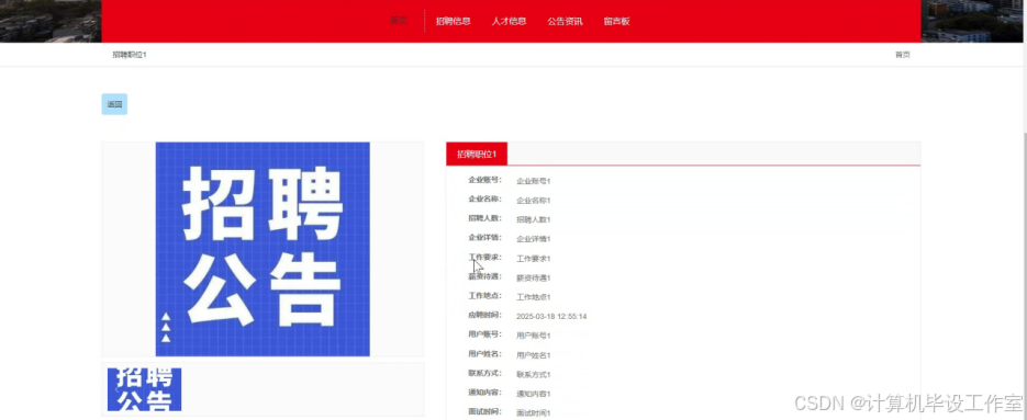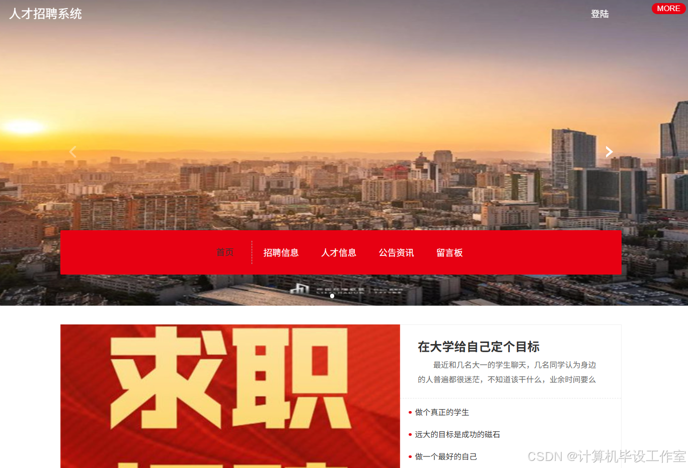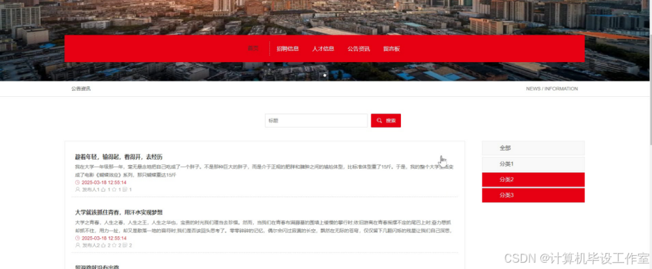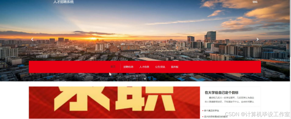 - 首页:用户登录系统后跳转至首页界面,导航栏下面依次是轮播图、公告资讯、留言板、招聘信息等。
